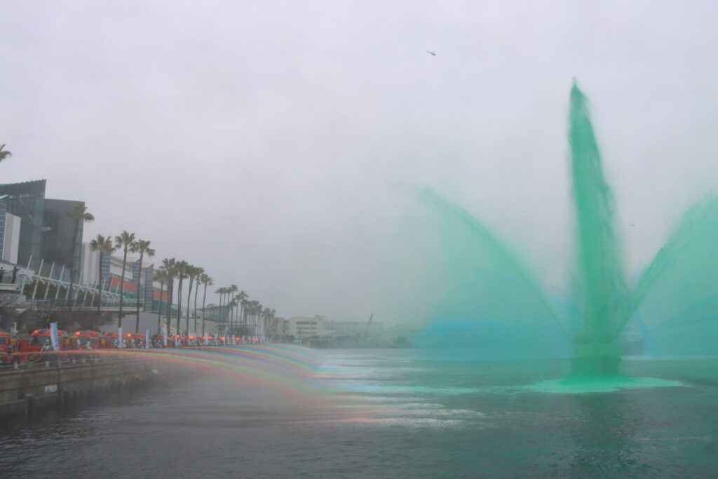 消防ヘリコプターなにわ、あたご、ひょうごの3機 消防艇消防車両などの機械部隊の分列行進をはじめとし、プロモーションビデオの配信などもされました。式は無観客で開催し動画配信アプリyoutubeを活用してライブ配信が行われました。『放水訓練開始』を合図に消防艇と消防車38台が一斉に放水され感動的な式典のフィナーレを飾りました。