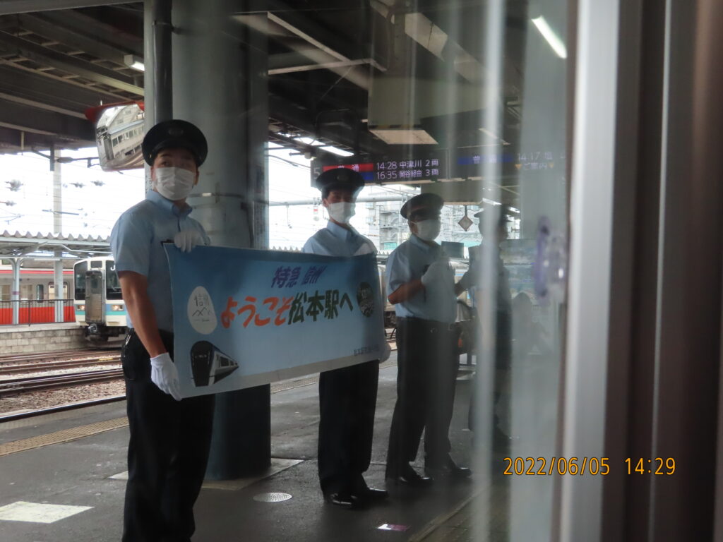 松本駅で駅員たちによるお見送り。ここから先は普段このE353系が乗り入れしない区間を行くので少しワクワクした。