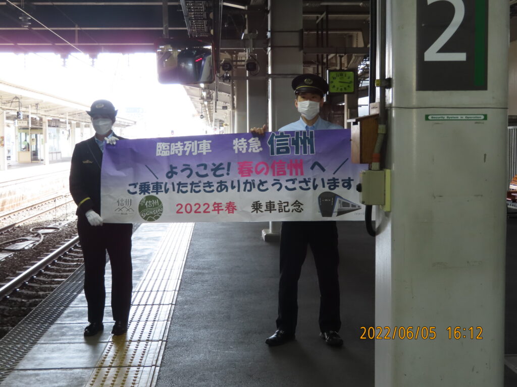 終点の長野駅での駅員たちによるお出迎え。短い乗車時間であったが、とても盛り沢山で充実した列車旅となった。