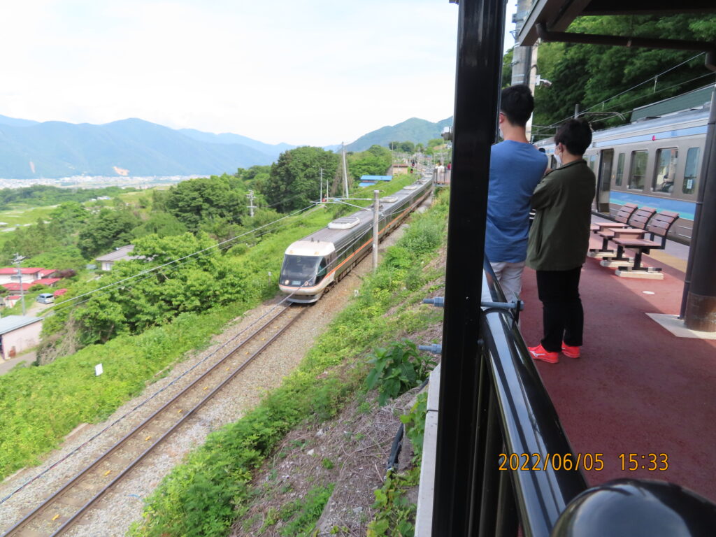 姨捨駅での停車中に長野行の特急「しなの」が目の前を通過。特急が特急に追い抜かれるという通常ではとても考えられないような大変面白い光景を見ることが出来た。
