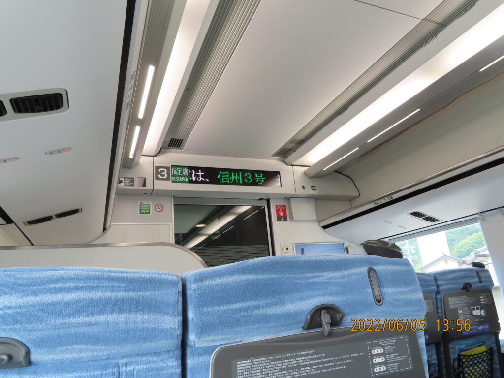 車内の案内表示器にはこの列車の運行に際して「信州3号」の表示が。これもかなり貴重な1枚である。
