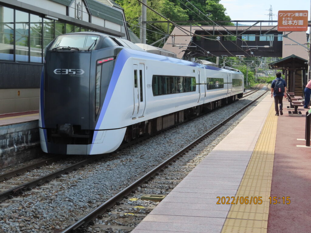 次にこの列車の停車駅であるが、筆者が乗車した特急「信州」3号の停車駅は、茅野を出発すると、上諏訪、下諏訪、岡谷、塩尻、松本、明科、姨捨、篠ノ井、終点長野の順番である。ちなみに特急「信州」は上下合わせて4本運行されており、そのうちの2、3号は前述した停車駅である(2号は長野発)が、残りの1、4号は明科、姨捨を通過する。