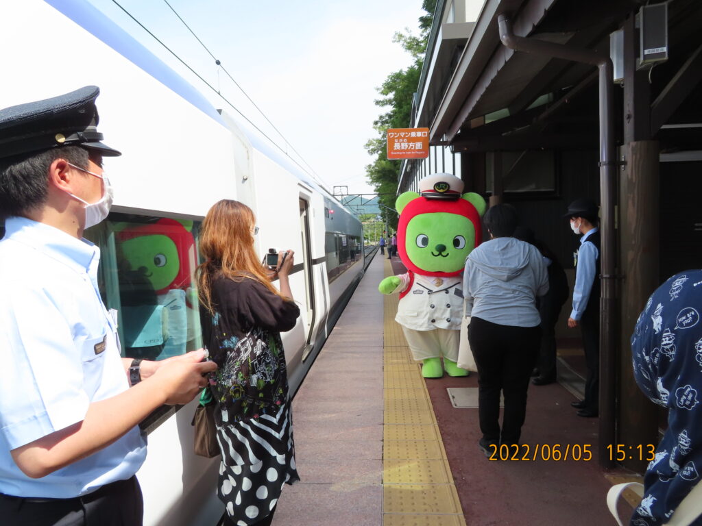 まず、この列車が停車する各駅では、横断幕等を掲げたJR東日本の駅員たちによるお見送りが行われた。ちなみに24分間も停車する姨捨駅では、駅員のみならず、長野県を代表するゆるキャラである“アルクマ”も来ており、実際に記念撮影を行うことも出来た。